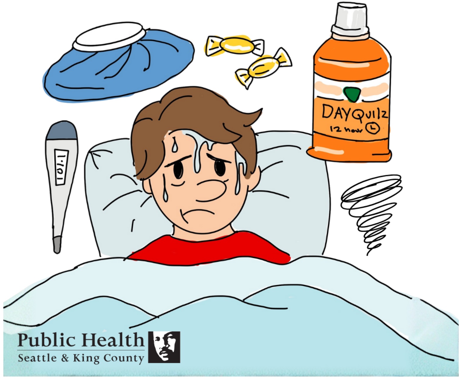 (graphic from Public Health Seattle & King County, see the full comic at tinyurl.com/flu-2-outcomes)